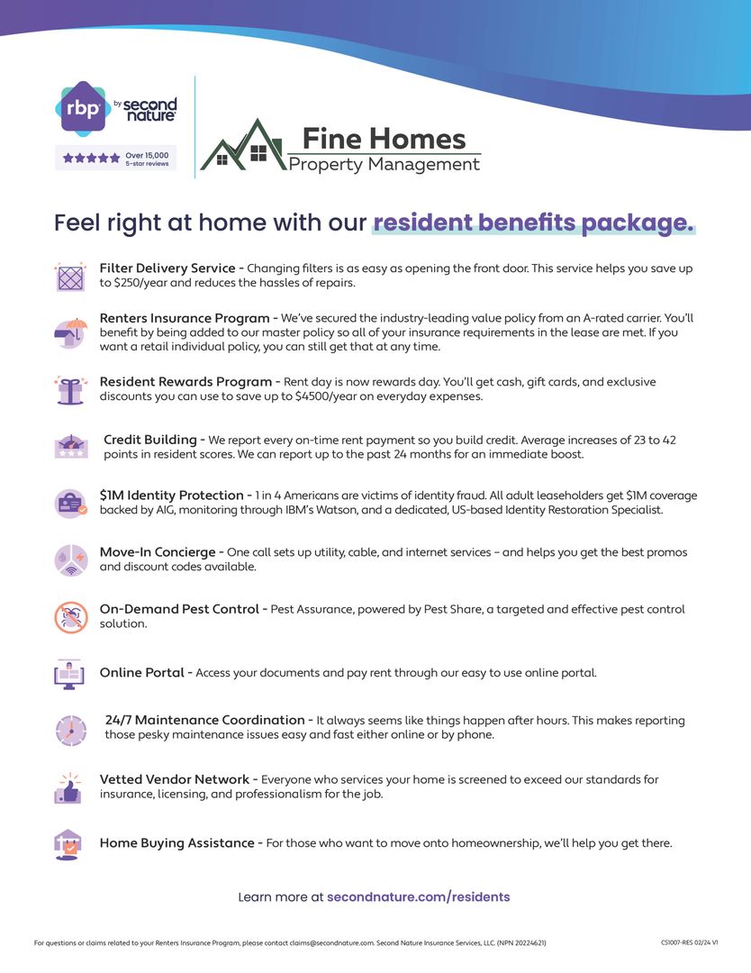All Fine Homes Property Management residents are enrolled in the Resident Benefits Package (RBP) for additional $49.95/month which includes liability insurance, credit building to help boost the resident’s credit score with timely rent payments, up to $1M Identity Theft Protection, HVAC air filter delivery (for applicable properties), move-in concierge service making utility connection and home service setup a breeze during your move-in, our best-in-class resident rewards program, on-demand pest control, and much more! More details upon application.